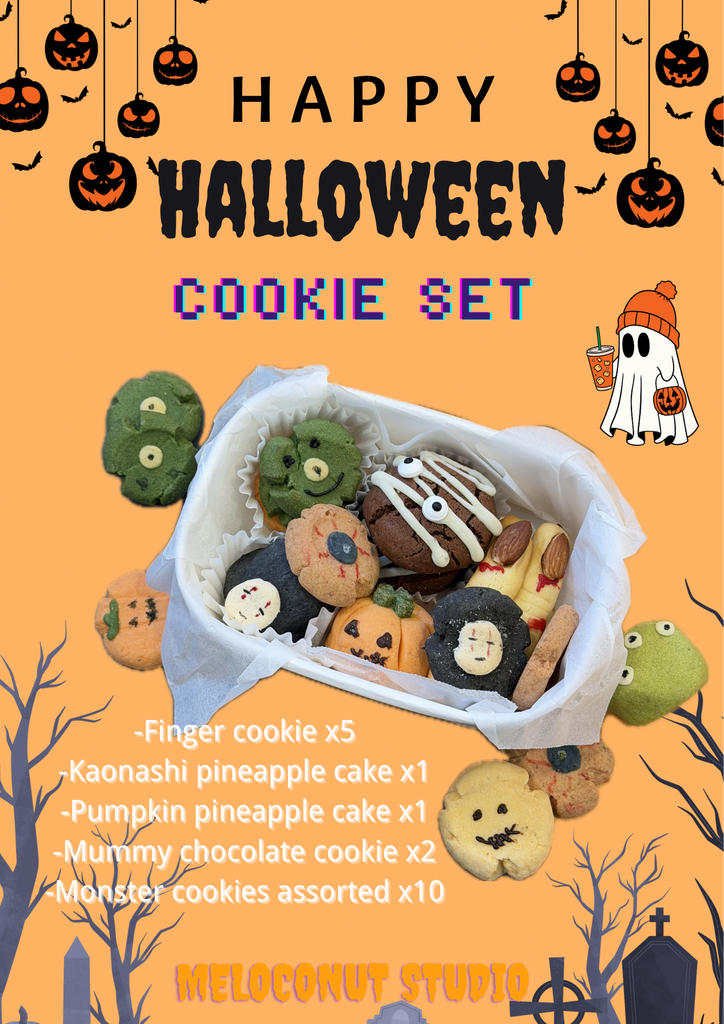 5pcs Finger Cookies, 1 pc Kaonashi Pineapple Cake, 1pc Pumpkin Pineapple Cake, 2pcs Mummy Chocolate Cookies and 10 pcs Monster Assorted Cookie.